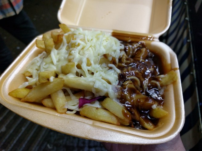 I’m handed a deep mountain of chips in a polystyrene box, with a dollop of gravy on the side (the guy behind the counter offered it to me since they’d had a mixup, and I couldn’t bring myself to turn it down for a purer, cheesier experience). This makeshift poutine surprisingly turns out a hell of a lot better than I expect – the gravy accentuates the saltiness that should be part of any good cheesy chips portion, but never gets in the rest of the food’s way.