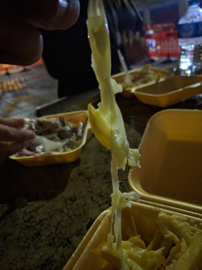 The cheese, on the other hand, is a mysterious beast altogether. The strands refuse to melt, only soften slightly, and are probably the most elastic thing I’ve ever eaten. That’s not to say it was bad (and hell, there was plenty of it), but the gravy probably ended up saving this meal from becoming an abomination against dairy (well, I assume it was dairy…). I need to find a polite way to ask people how they prepare the cheese.